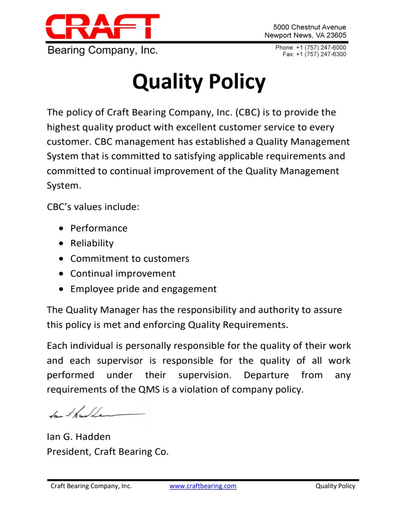 Craft Bearing is proud to share our attainment of ISO 9001:2015 status, which assures our customers that we meet the highest standards for quality through our QMS (Quality Management System) and supporting processes, tools and resources. Our ability to consistently deliver to or exceed customer and regulatory compliance standards represents the promise that Craft Bearing is so well known for.